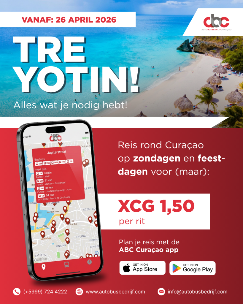 Aanstaande ๐ณ๐จ๐ง๐๐๐ , ๐๐ ๐๐ฉ๐ซ๐ข๐ฅ ๐๐๐๐, kunt je op alle routes reizen alleen voor Tre Yotin! Met XCG 1,50 reis je naar je eindpunt. Dit tarief geldt op zondagen en feestdagen. Om je reis gemakkelijker te maken, download onze app: ABC Curaรงao. Daarmee kun je vertrektijden bij alle haltes bekijken of je route plannen.